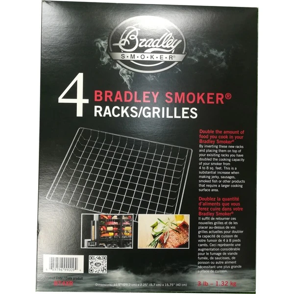 Das Set Räucher-Roste BT4XR von Bradley enthält vier zusätzliche Racks mit großer Maschenweite, passend für jeden Bradley Smoker.Art.-Nr.: 1600902