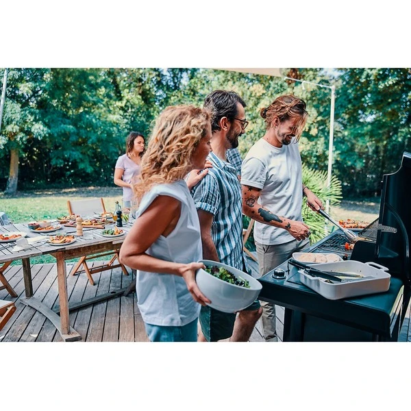 Der 4 Series Deluxe Gasgrill bietet hochwertige und zuverlässige Materialien in Verbindung mit viel Komfort. Die praktische InstaStart-Zündung ist eine in den Gasregler integrierte elektronischen Zündung. Beim Drücken des Reglers wird durch Spannung der Funke gezündet, und beim Drehen des gleichen Knopfes strömt das Gas aus, was direkt durch den Funken gezündet wird. Die patentierte Blue Flame Power Technologie heizt den Grillrost schnell und sehr gleichmäßig verteilt auf die benötigten Temperaturen auf, und die Even Temp Technologie sorgt für eine konstante Hitze auf der gesamten Grillfläche. Dank dieser patentierten Technologie wird eine Temperatur von über 250°C auf einem Großteil der Grillfläche erreicht. Die zahlreichen optional erhältlichen Campingaz Culinary Modular Zubehöre sorgen für noch mehr kulinarische Vielfalt beim Kochen und Grillen. Mit den vier gummierten Gelände-Schwerlastrollen und zwei Feststellbremsen lässt sich der 4 Series Deluxe zuverlässig auf kleinstem Raum manövrieren und sicher abstellen. Die beiden „Push2Fold“ abklappbaren Seitentische bieten viel Platz für Grillgut und Zubehör. In den neuen Gasgrill-Modellen 2021 ist die innovative Campingaz InstaClean Aqua Technologie verbaut. Dank des Wassers wird das anschließende Reinigen des Grills erleichtert. In die von vorne zugängliche Fettauffangschale wird Wasser gefüllt, was das Einbrennen von Fett und Essensresten in der Schale verhindert. Das beim Grillen verdunstete Wasser wirkt außerdem im gesamten Grillinnenraum fettabweisend, sodass sich das Fett nicht so leicht an dem Material festsetzen kann. Dank dieses cleveren Systems muss man bei der Reinigung nicht angestrengt schrubben, stattdessen können die Teile einfach abgewischt werden. Das benutzte Wasser kann ganz einfach durch einen Abfluss in der Fettauffangschale abgelassen werden. Die Deluxe Modelle sind außerdem mit einem Schmutzwasserbehälter inkl. Filter ausgestattet, sodass das Wasser von festen Bestandteilen getrennt werden kann, für eine noch einfachere Entsorgung.Art.-Nr.: 1671780